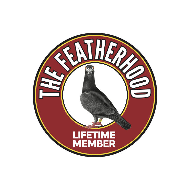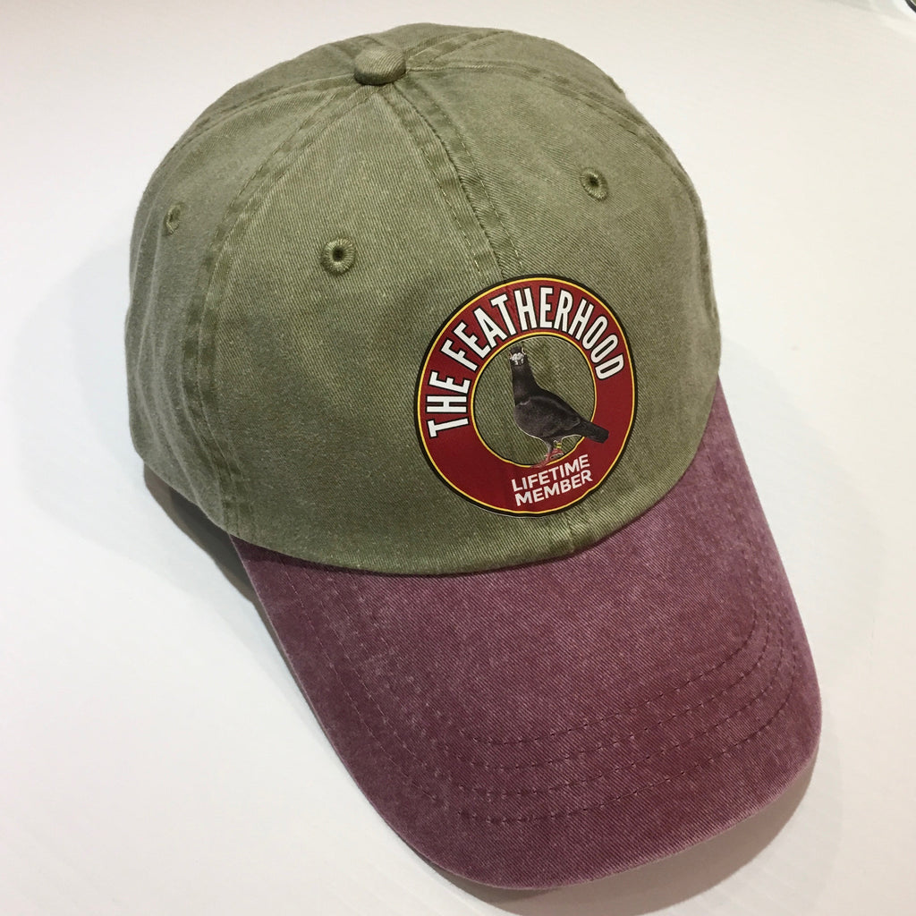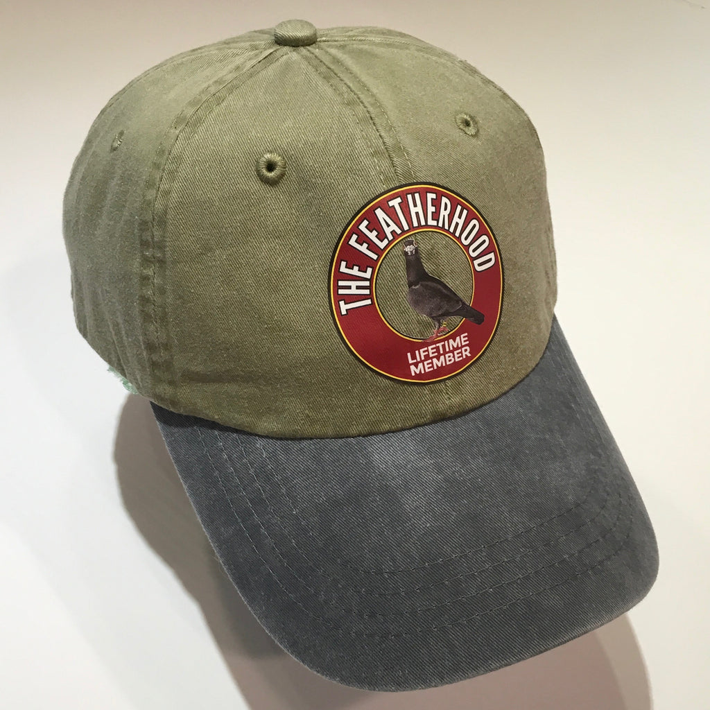 Adult unstructured hat, low profile, 100% cotton garment washed twill, 6-panel, one-size, adjustable slide closure in the back with brass buckle with our FEATHERHOOD Lifetime Member round logo.